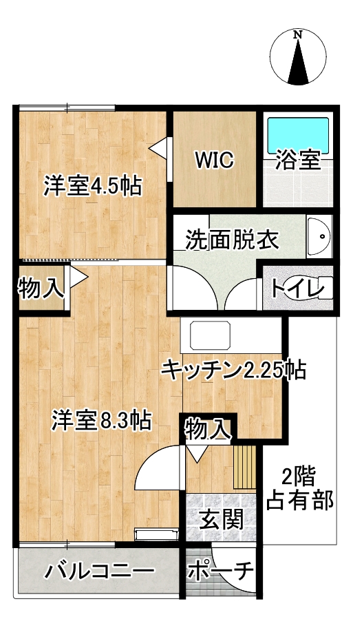 1LDK(洋室4.5帖、LD8.3帖、K2.25帖) |